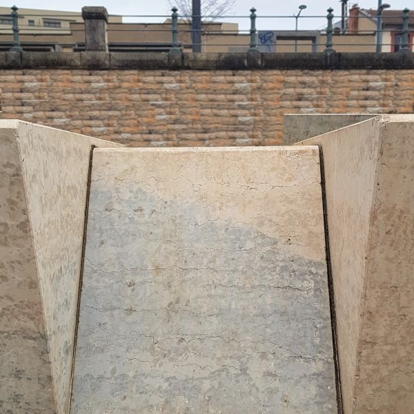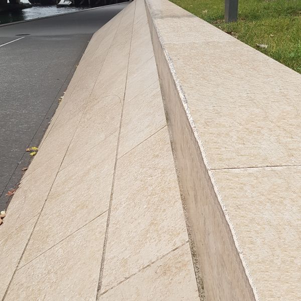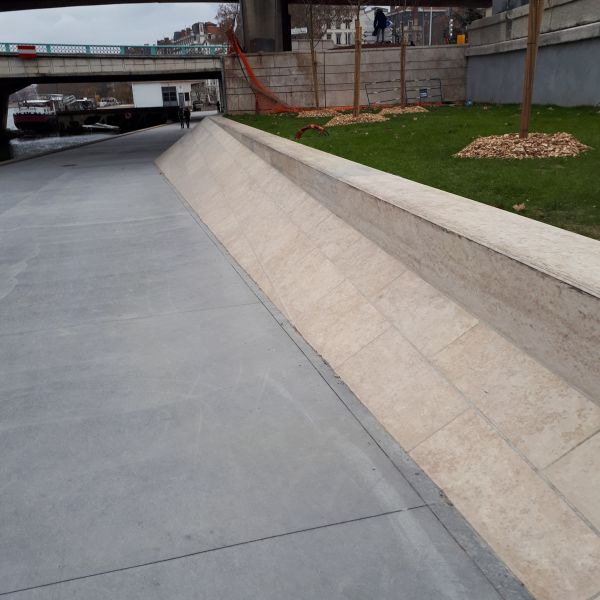 - Sous le pont Kitchener Marchand, on retrouve un perré avec un habillage calcaire composé de dalles de 100x50 et 100x32.8, surmonté d'une couvertine 95.5x40 et 88.2x40 cm.