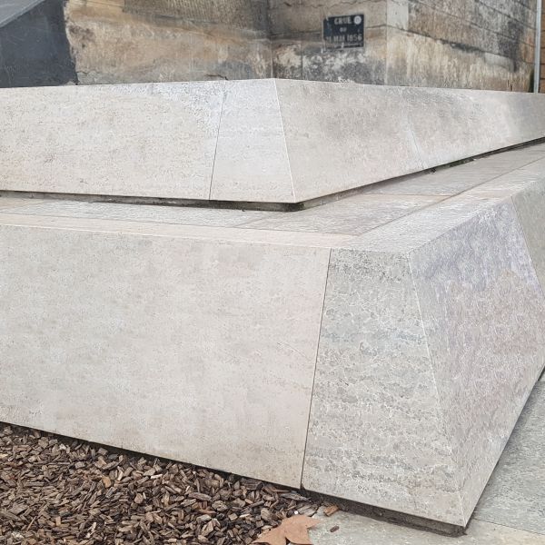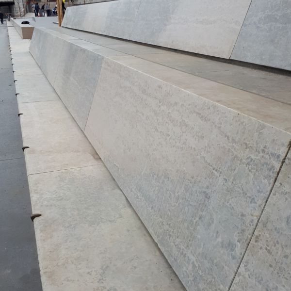 - 7 rangées d'assises en calcaire composées de 271 banquettes, de dimensions 200x80x50 cm avec coupe biaise de 14°, pour une longueur totale de 542 mètres de pose.