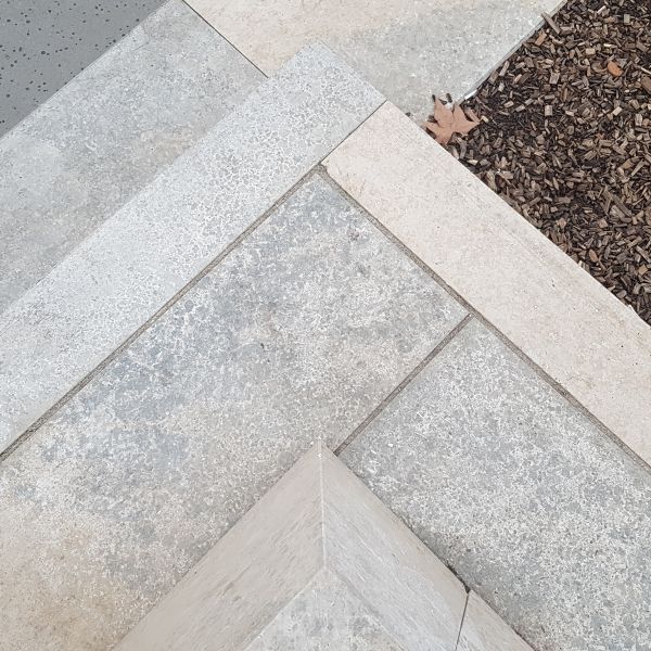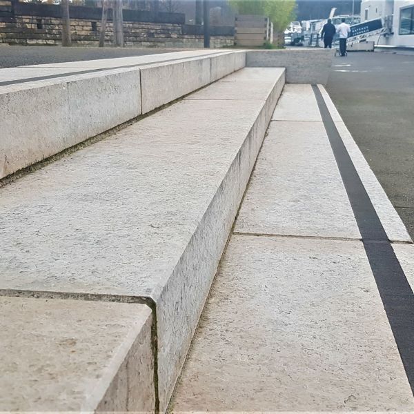 Afin de réaménager les 1 km de long du Quai Rambaud, les maîtrises d'œuvre et d'ouvrage ont choisi le calcaire Kanfanar Selina bayadère en teinte bleue et beige (70% beige et 30% bleu) de Croatie en finition flammée et adoucie pour les banquettes. Cette pierre d'une teinte très claire, qui borde désormais les jardins du quai Rambaud, permet d'inscrire cette zone comme étant un air de promenade et de déplacement à mobilité responsable pour les habitants et les visiteurs du 2ème arrondissement de Lyon.