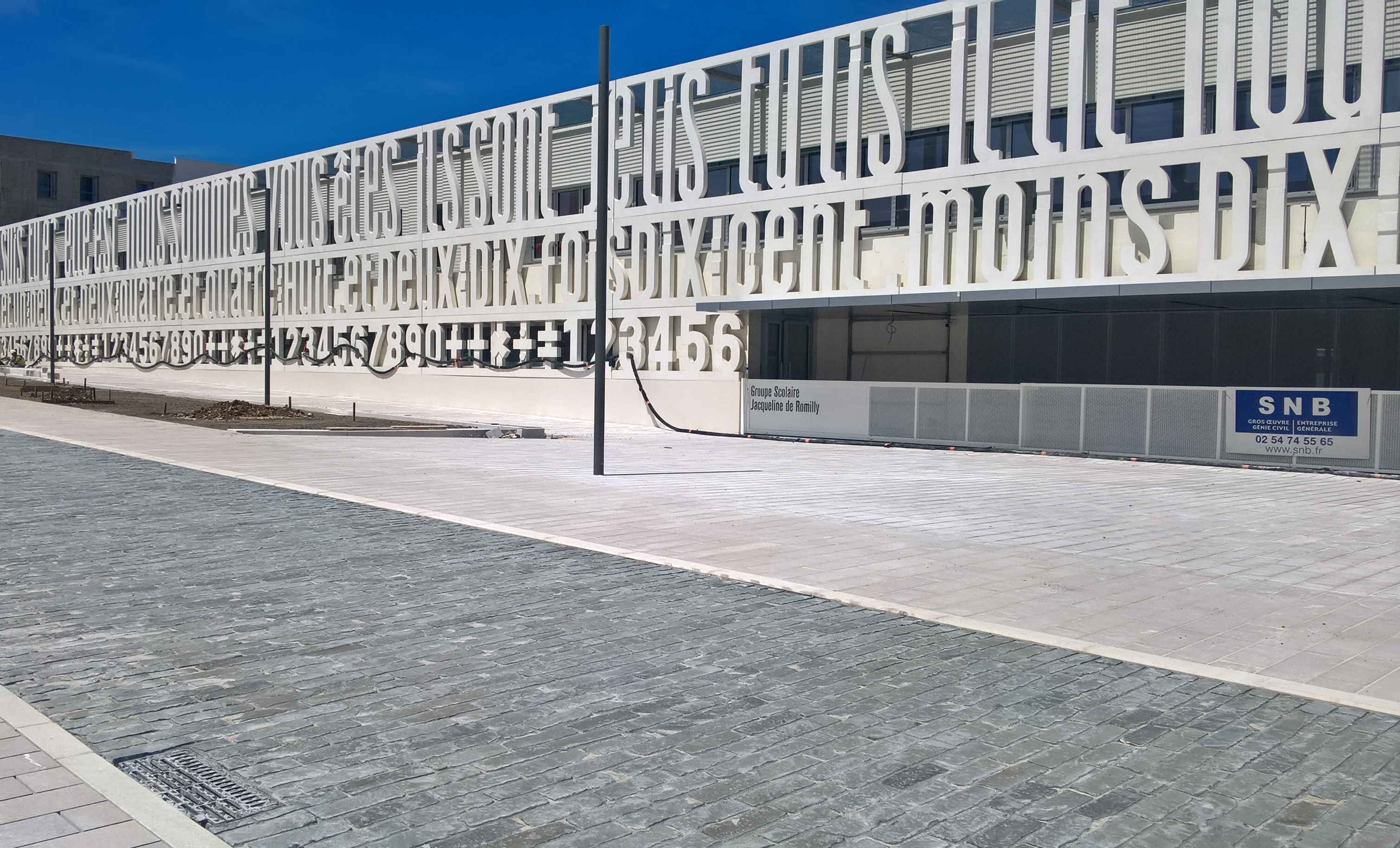 Situé entre le château de Versailles et le lycée militaire de Saint-Cyr, le site en construction a donc demandé une attention esthétique particulière, ce qui a conduit la ville à exiger des matériaux nobles à la hauteur des deux édifices historiques. Pour répondre à ces enjeux, De Filippis Minéral Conseil (spécialisée dans la fourniture de pierres naturelles) a été choisie afin de proposer une solution de pavage conforme aux normes françaises (résistance au gel, compression, flexion, glissance).