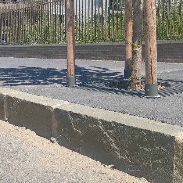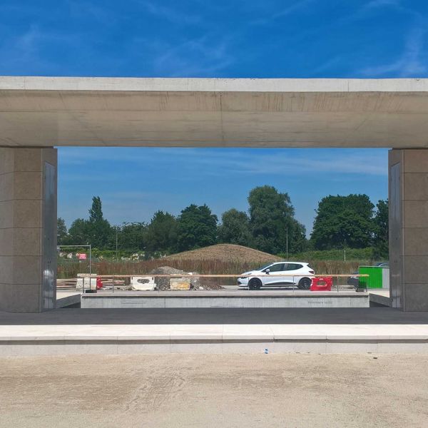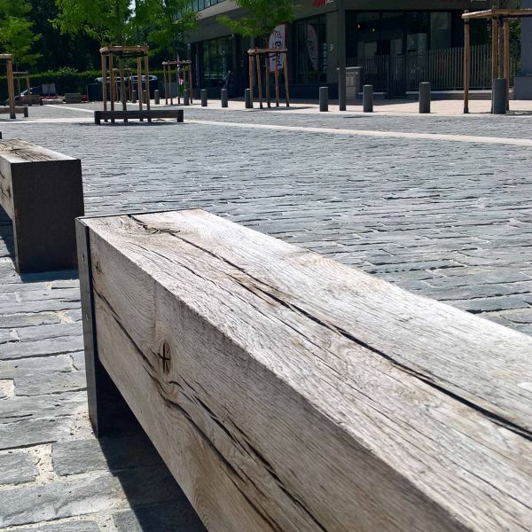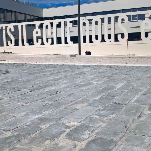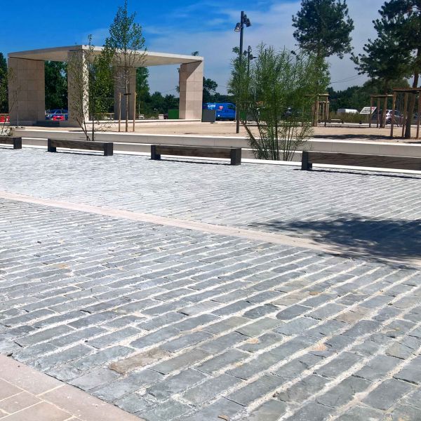 La société s’est associée à Watelet TP pour procéder à la pose de gradines en calcaire Kanfanar (laisse apparaître des fossiles de couleur plus foncée en proportion variable selon le choix du banc) et les pavés en grès Albanera (gris modéré avec reflets bleutés).