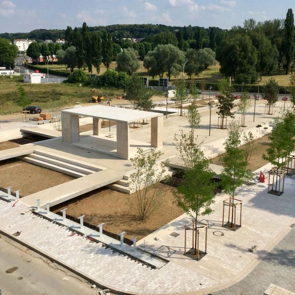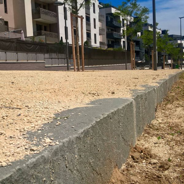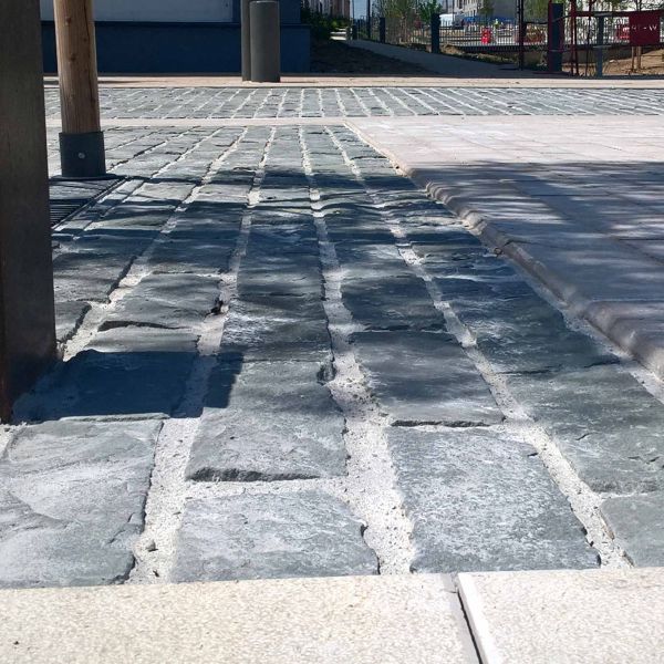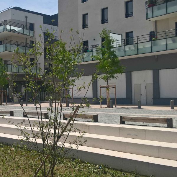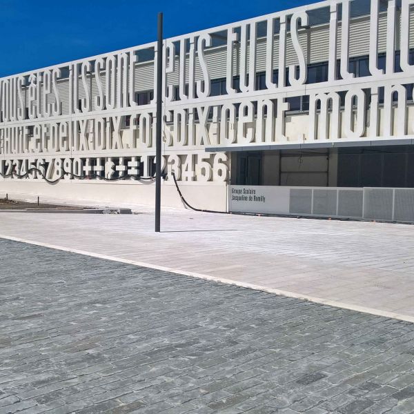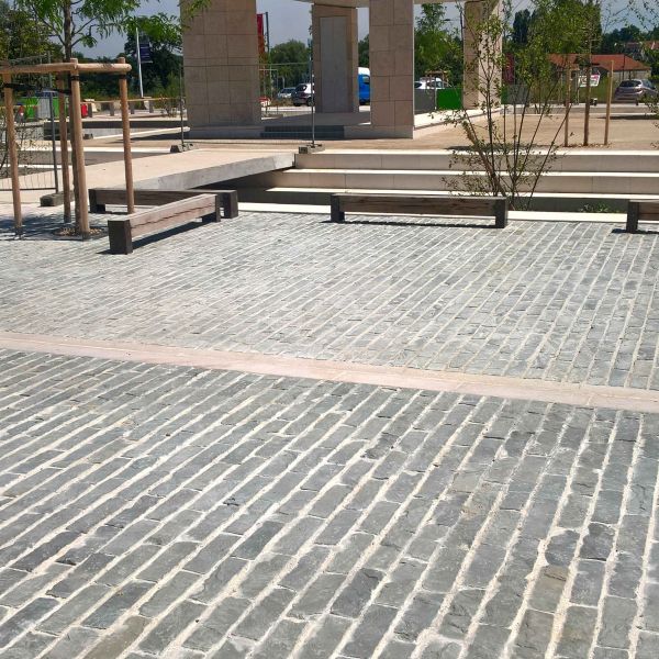 Dans le cadre de l’aménagement de la ZAC Charles-Renard de Saint-Cyr-l’École (78) réalisée par Watelet TP pour le compte de GPA (anciennement AFTRP : Agence Foncière et Technique de la Région Parisienne), De Filippis Minéral Conseil a fourni un assemblage inédit sur le territoire français : celui d'un grès gris-bleuté et d'un calcaire beige, l'Albanera et le Kanfanar.