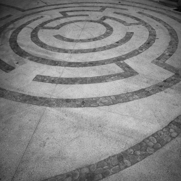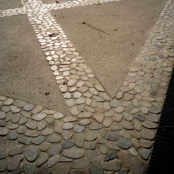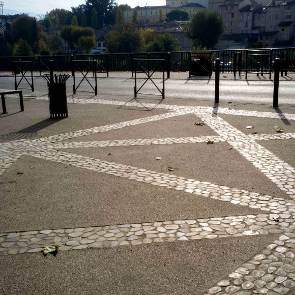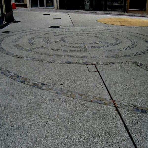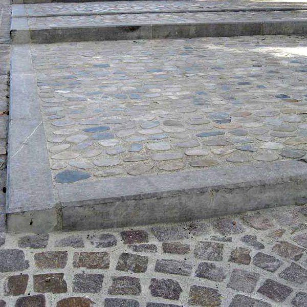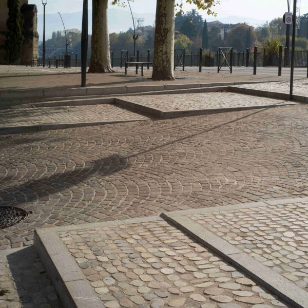 La pierre mise en oeuvre est principalement du porphyre du Trento (volonté d'une mixité de couleurs chaudes) : 1500m² de pavés, accompagnés de bordures et d'emmarchements en calcaire Chomerac, ainsi qu'un labyrinthe confectionné à base de galets sciés.