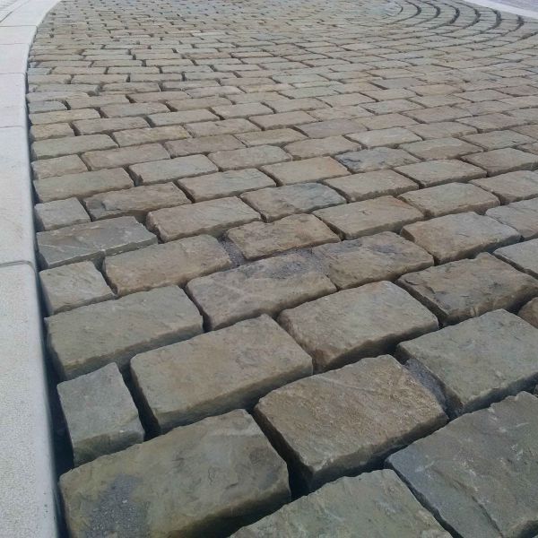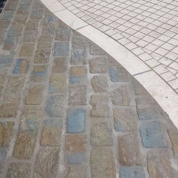 Un type de pierre un peu moins couramment utilisé, car plus rare d'extraction et de transformation européenne, a donc été proposé à la pose sur les zones circulées : le grès dur siliceux. Minéral Conseil a donc fourni un grès en sélection spéciale 100% beige, de son gisement Albanera. Les pavés grès vont nécessairement se patiner à l'usage, mais à l'inverse d'un calcaire, sans que la glissance nominale (celle mesurée en laboratoire, et annoncée sur les PV d'essai), ne diminue ! Cette patine donnera un aspect "antique" aux pavés, dans un contexte d'aménagement neuf et pérenne.
