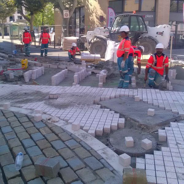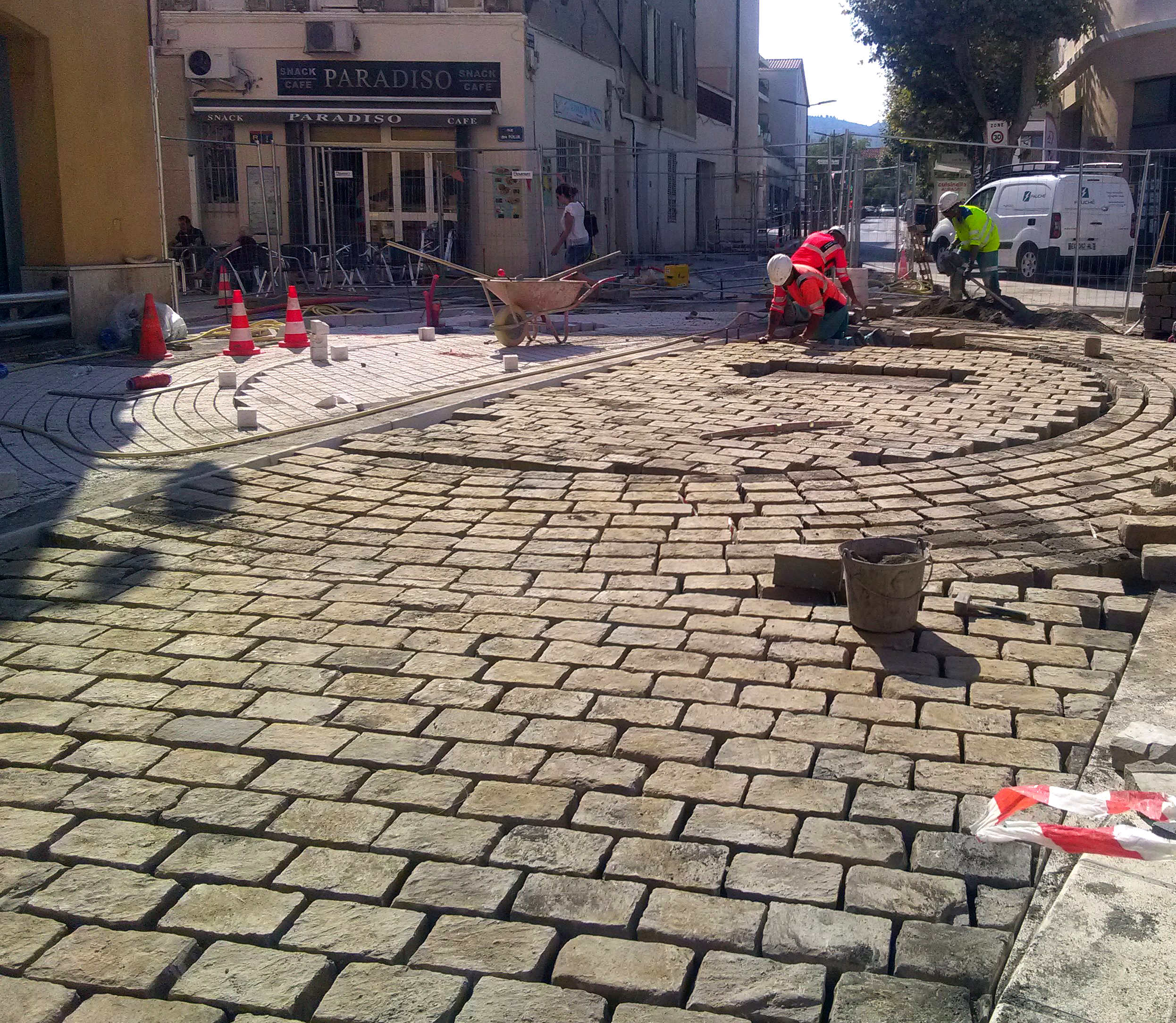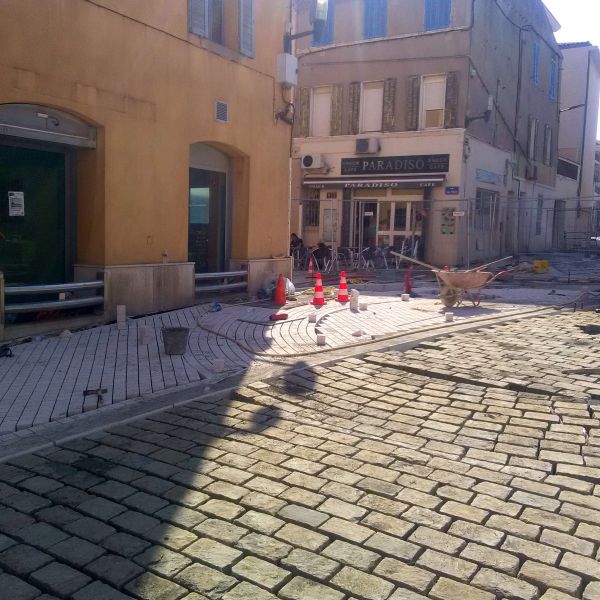 C'est dans ce contexte minéral que De Filippis s'est vu confié la réalisation de la place des Maquisards, et de ses abords, en plein coeur de ville de La Ciotat. Comme vous le remarquerez sur les photos jouxtant cet article, une dominante de tons beiges a été recherchée par les concepteurs. Afin d'assurer une cohérence architecturale, et une continuité adjacente d'usage de matériaux. Tout calcaire beige suffisamment dur pour une utilisation en zones circulées y répondrait pleinement, mais son usage est néanmoins peu moins recommandé en voirie, car plus difficile d'entretien, et pouvant être rendu glissant à l'usage, par un trafic routier répété.