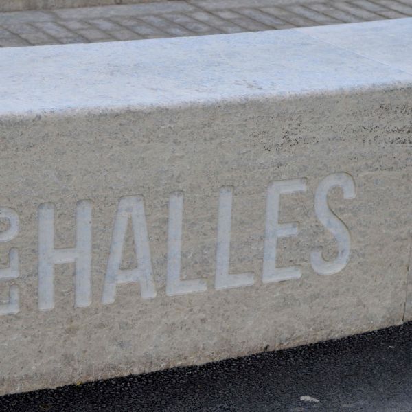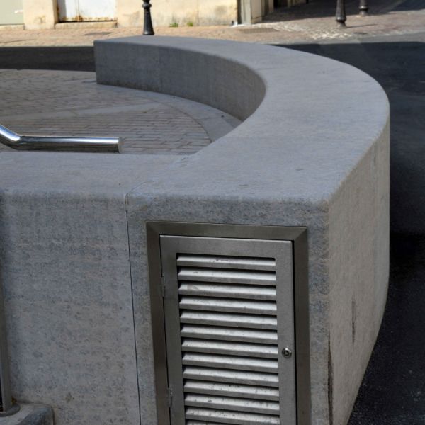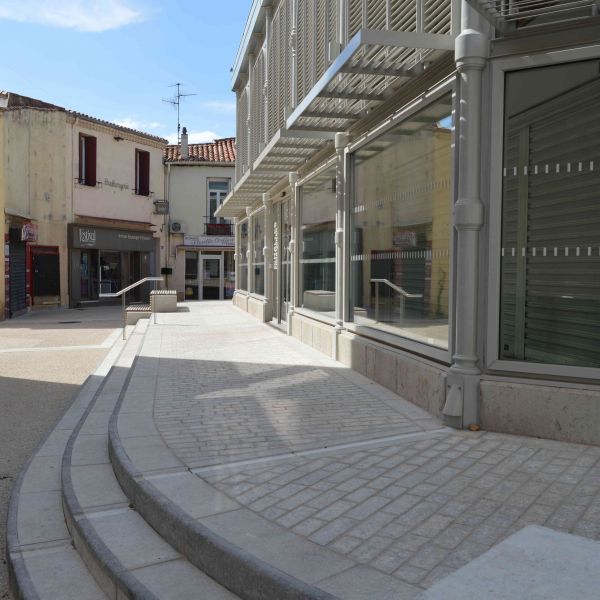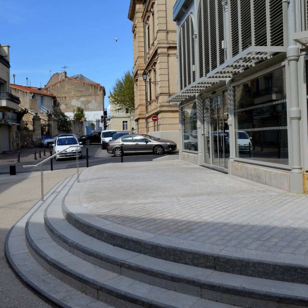 Le chantier a été réalisé par Eurovia Juvignac. Chantier très qualitatif avec des contremarches en pierres plus foncées, du mobilier urbain gravé, des pièces d'évacuation d'eau très travaillées.