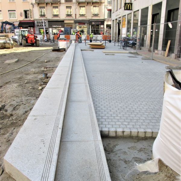 Le caniveau est matérialisé par des bordures quart de rond de 2 cm permettant d'avoir une zone circulée et une zone piétonne qui cohabitent. Il y a une notion d'espace qui se crée dans cette rue commerçante de seulement 12m de large.