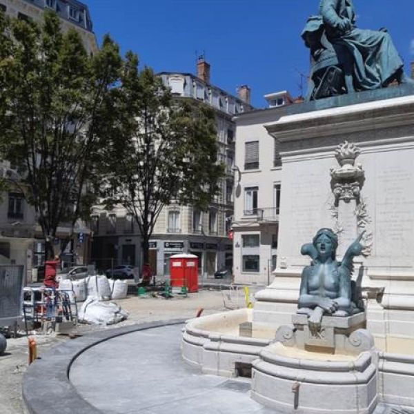 La place Ampère sera embellit avec la réalisation d'un miroir d'eau accolé à la fontaine existante. La pierre choisie pour le miroir est le calcaire Bleu du Hainault.