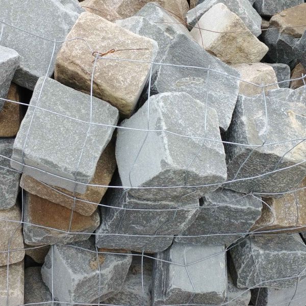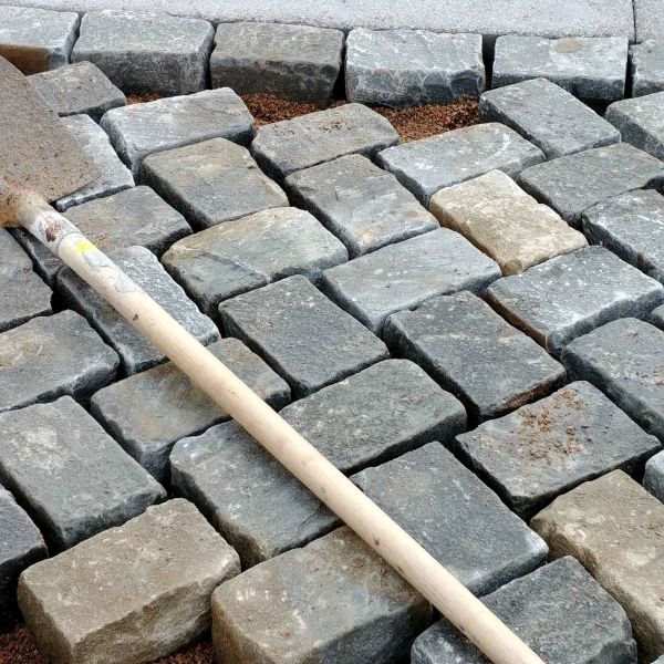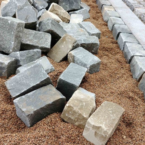 - 1200 m² de pavage en grès Albanera Gris et Albanera Gris/Beige, finition antique et brute de clivage