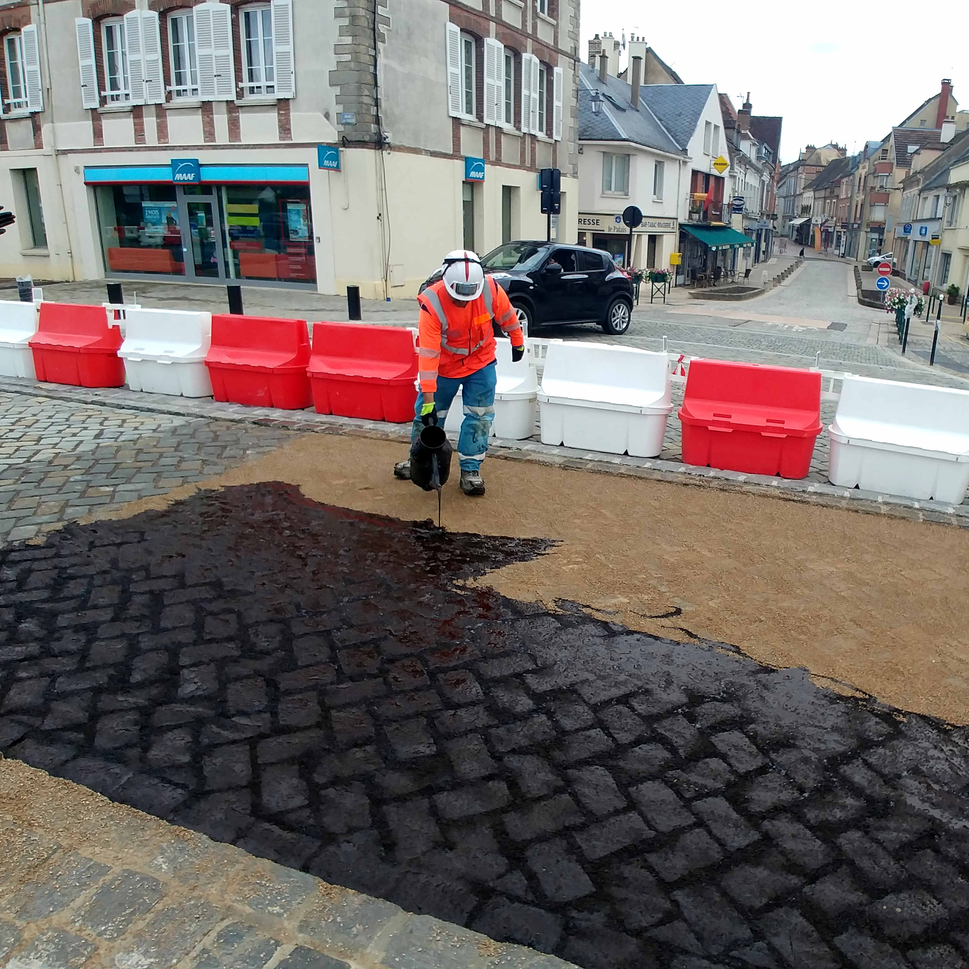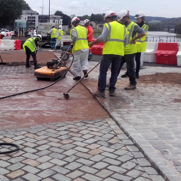 Les travaux commandés par la Ville visaient à réhabiliter les quais de la Ville de Sens, aux abords du centre historique. Une grande partie de la surface pavée constitue une ligne à fort trafic et contraintes (bus), et a donc été dimensionnée selon une structure souple (lit et joints), avec un maillage de pose en chevron solidement jointées à l'émulsion bitume.
