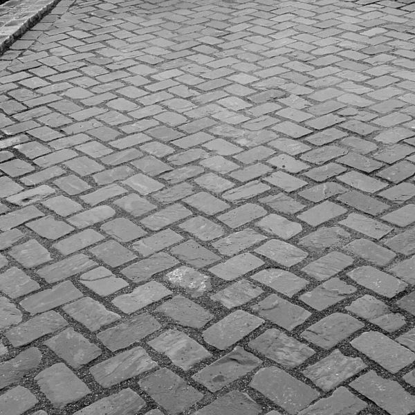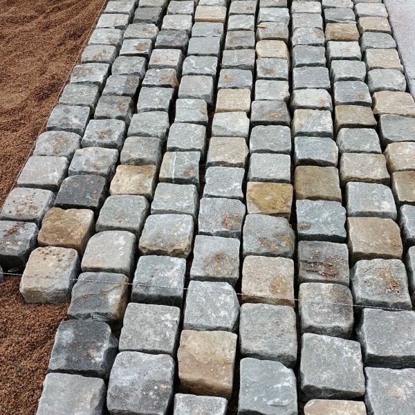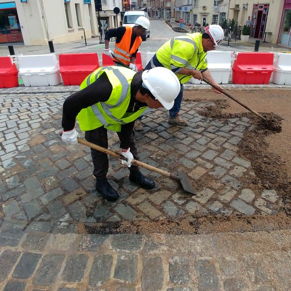 La maîtrise d’œuvre a choisi une pierre d'origine européenne, le grès dur siliceux Albanera (fiche pierre ici) afin de garder une cohérence esthétique avec le grès ancien posé historiquement sur la ville, mais dont l'extraction n'est plus possible, pour des projets de cette envergure. Il a été retenu un mélange de pavés-boutisses en proportion 80% grise, 20% beige, en finition antique , pose en chevron traditionnelle, pour la voirie. La finition antique a été proposée par nos équipe afin de limiter l'accrochage résiduel de l'émulsion lors de la réalisation des joints.