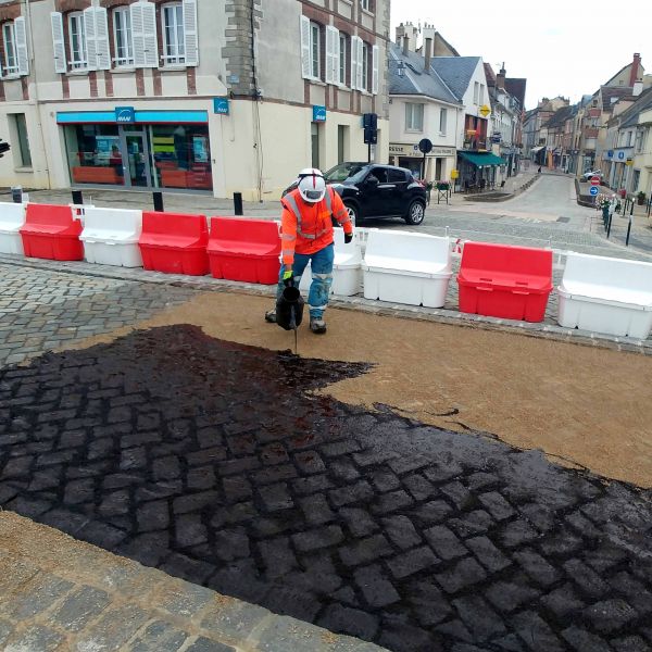 Application de joints à l'émulsion : on savait le procédé déjà très délicat pour la mise en oeuvre de pavés en granit ou de récupération. Les équipes De Filippis, habituées de ce procédé, ont fait encore mieux, et les réalise sur du grès neuf. Ce qu'il y a de plus adhérent et abrasif, en terme de surface minérale...
