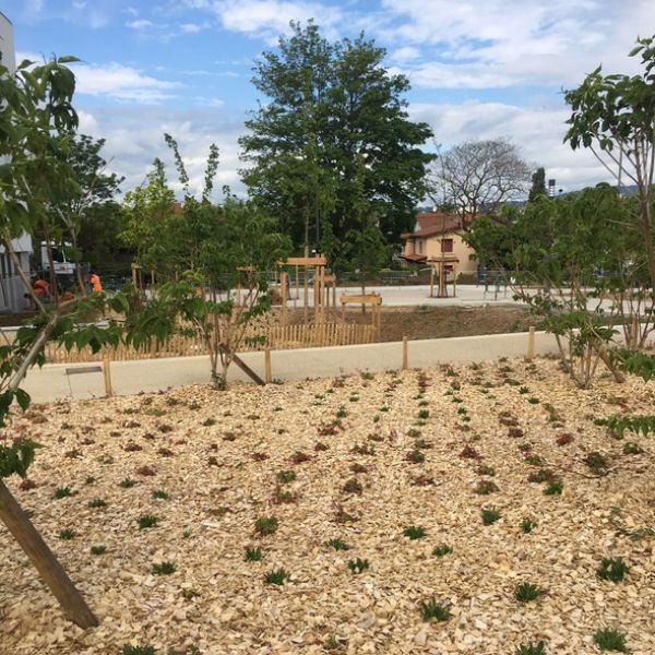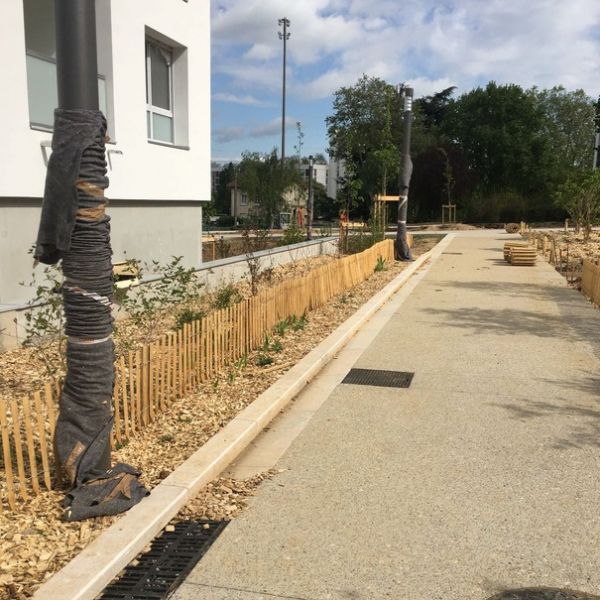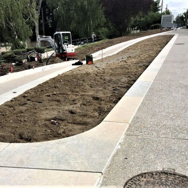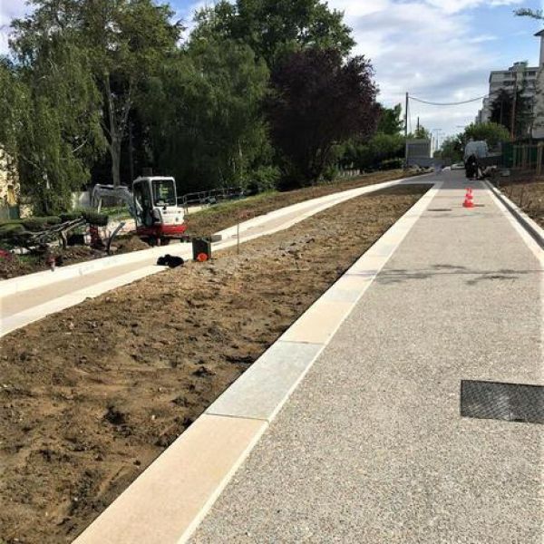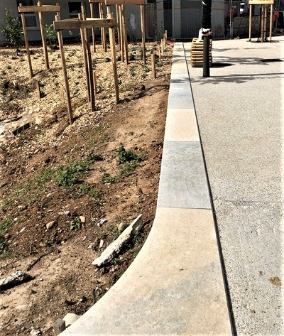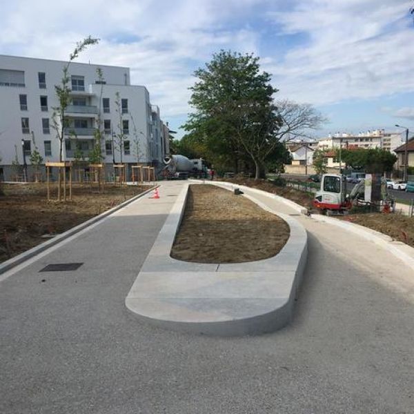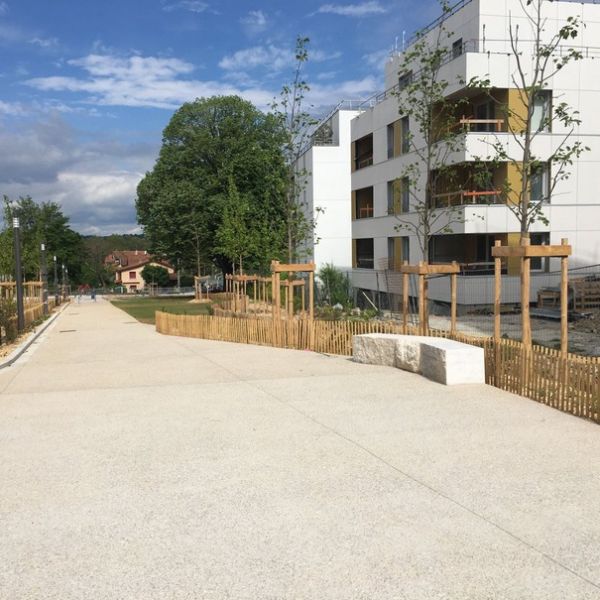 Afin de mettre en valeur les alentours de plusieurs nouvelles résidences de la ville de Caluire (69) où se trouvait auparavant un simple terrain vague, l'entreprise De Filippis a réalisé les aménagements extérieurs, notamment à l'aide de béton désactivé et de bordures en pierre calcaire bayadère (mélange de bleu et de beige) directement importée de Croatie.