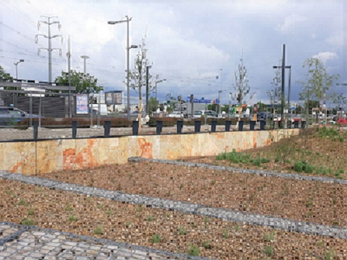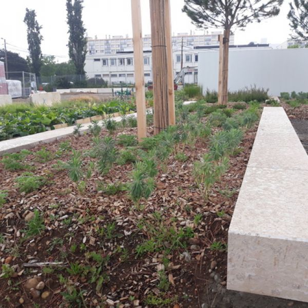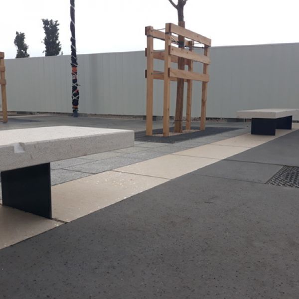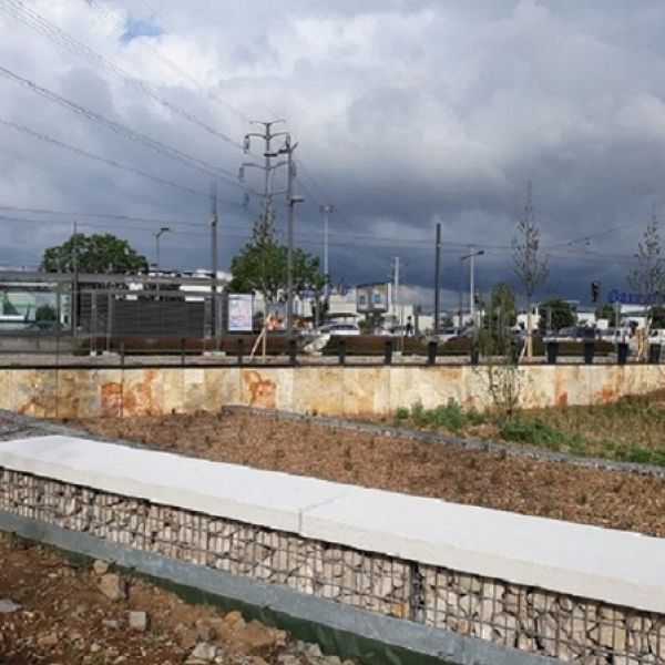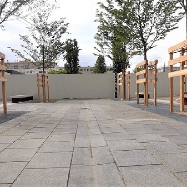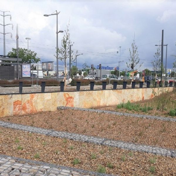 Le cabinet "In Situ" a choisi divers matériaux naturels pour souligner les espaces qualitatifs du nouveau quartier le Puisoz à Vénissieux. La volonté est de créer une place et un cheminement piéton qui traverse tout le quartier afin d'accueillir le public diversifié du Puisot.
