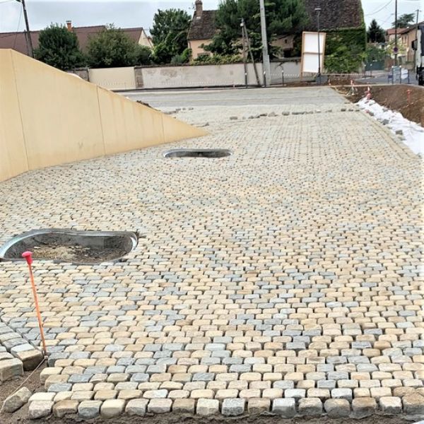 Ainsi près de 600 m² de pavés antiques ont été posé en chaînettes, c'est à dire en rangs alignés, joints croisés. La volonté des décideurs du projet est de réduire la circulation routière à un sens unique afin de sécuriser le site pour les entreprises intervenant sur la place et les rues adjacentes. >Les travaux ont débuté en Juillet 2019 pour s’achever en septembre 2019.