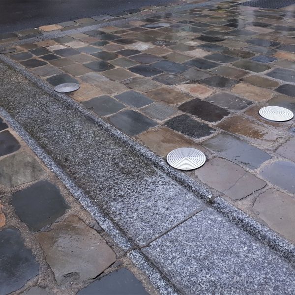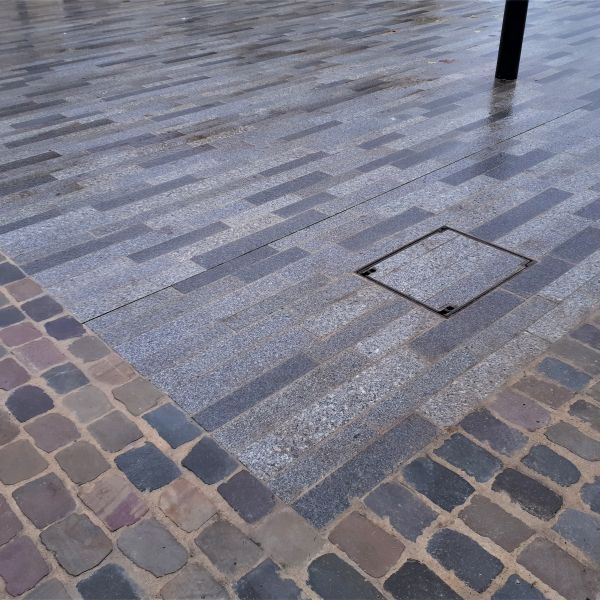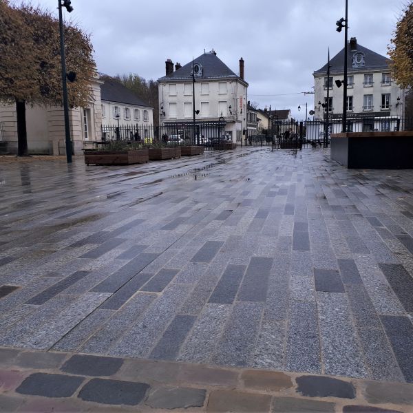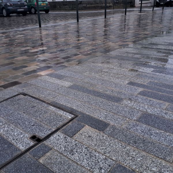 Ces différentes pierres, qui ont pour provenance les carrières bretonnes, ont toutes été travaillées avec une grande précision par l'entreprise Rault Granit. en effet, une exécution minutieuse de la taille de pierre a été nécessaire pour les bordures de raccordement à profil biais, les modules trapézoïdaux pour les courbes et les caniveaux à profil spécifiques en gravure monobloc.