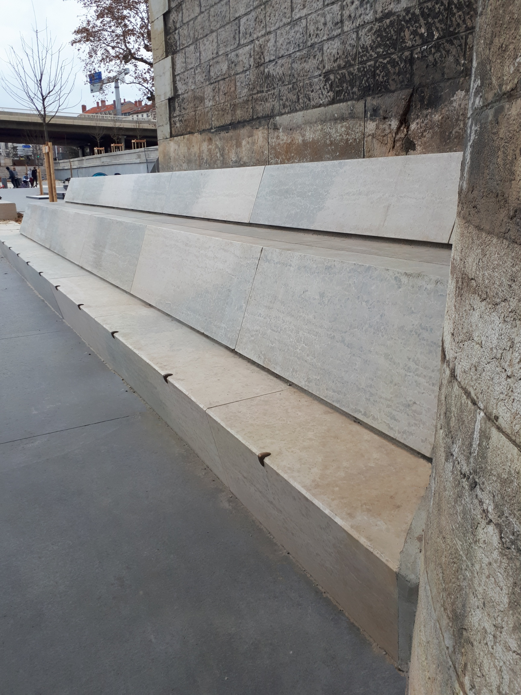 Le rôle de De Filippis Minéral Conseil dans l'aménagement du quai Rambaud a donc été de fournir et poser du mobilier urbain en pierre naturelle sur une longueur d'1 km.