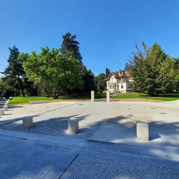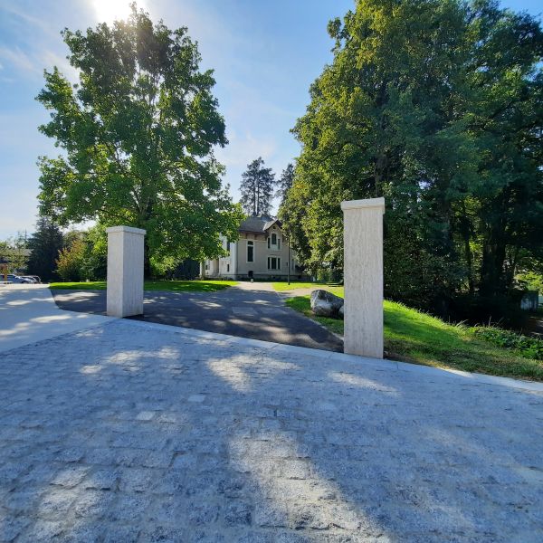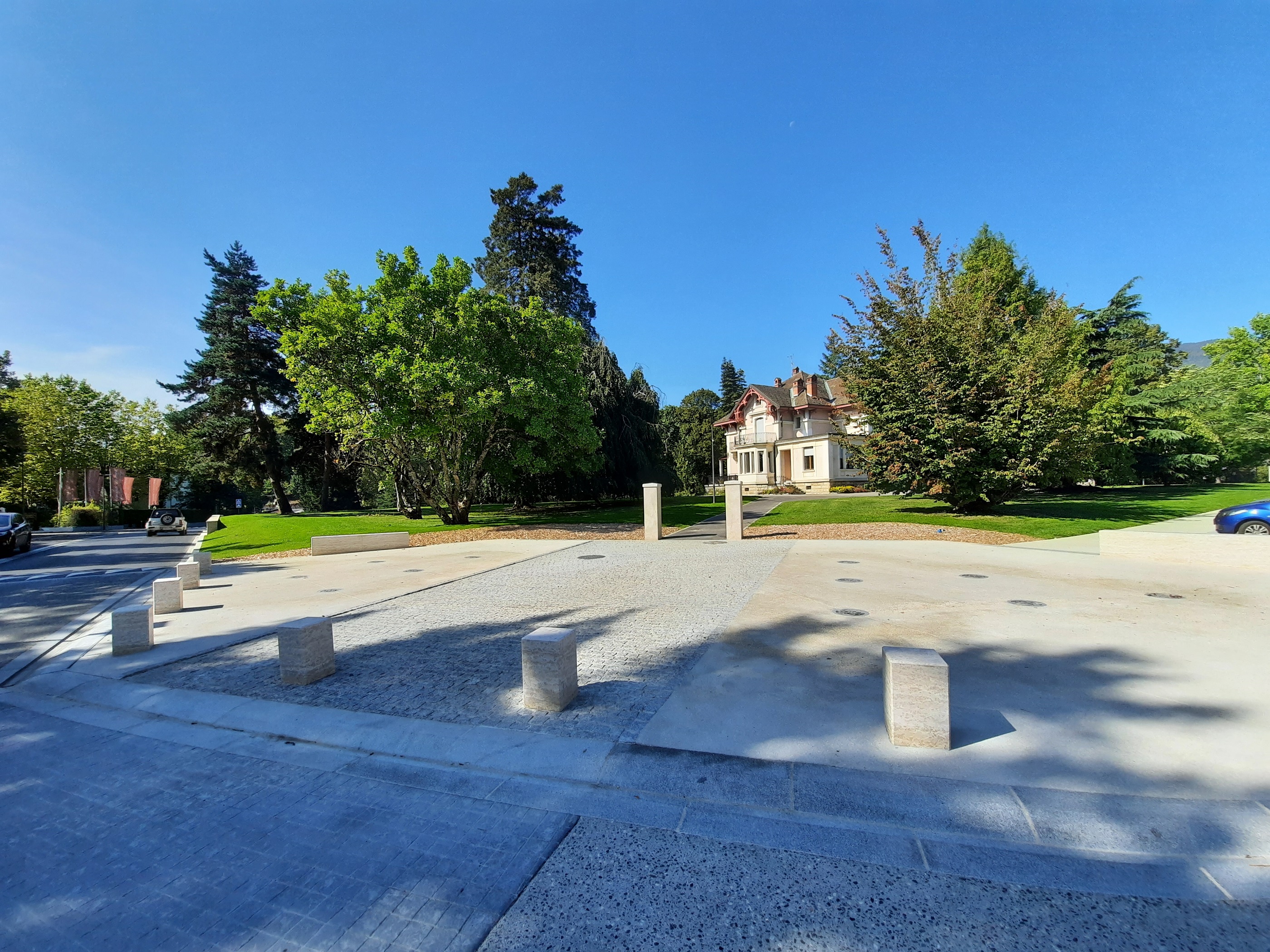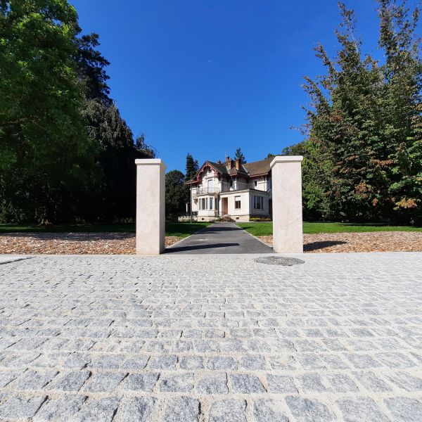 La Villa Rolland, bâtiment historique de la culture des thermes de Divonne, profite désormais d'un nouveau parvis en granit gris Quintana. Ce sont au total 140 m² de pierre naturelle qui tapissent désormais son entrée délimitée par des bordures en calcaire. Le calcaire Kanfanar se fait donc remarquer sur ce réaménagement : on y retrouve des banquettes, des bornes, un muret et des piliers à l'entrée du parc de la Villa Rolland.