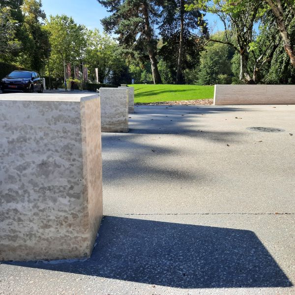 La particularité de la pierre sur ce chantier réside tout particulièrement dans ses teintes. Grâce à la finition adoucie de plusieurs pièces telles que les banquettes et les bornes. On retrouve un calcaire Kanfanar beige, aux teintes fleuries ; ce qui se traduit par plusieurs nuances sur sur la pierre, allant du claire au sombre.