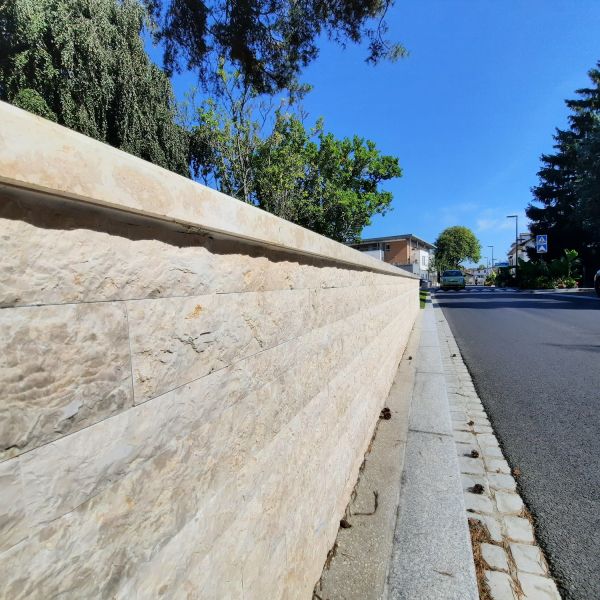 Le muret, entièrement réalisé en calcaire Kanfanar, est réalisé avec des pièces en finition éclatée. Ce dernier vient border le parc de la Villa Rolland pour créer la délimitation avec la voirie et maintenir la terre végétale du parc.