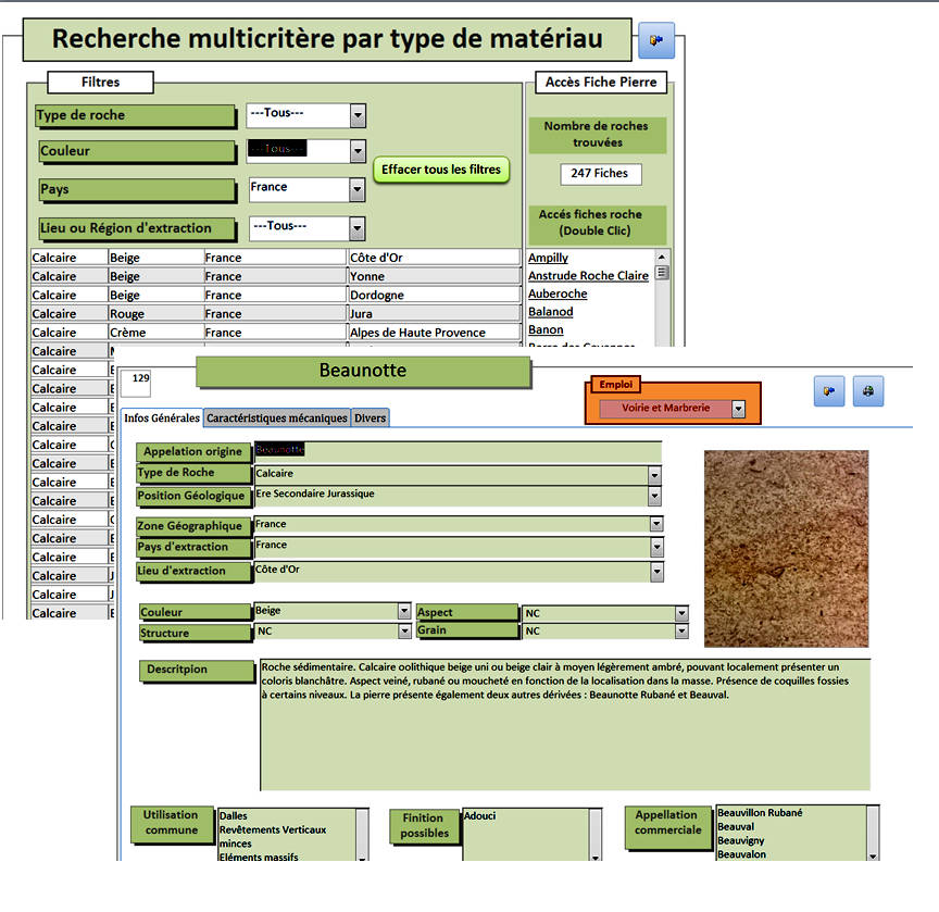 Nous pouvons donc vous renseigner, et vous orienter, selon vos exigences en termes d'esthétique, de forme, de dimensions des modules de pierre, vers la pierre la plus adaptée. Nous disposons d'ailleurs d'une application de recherche multicritères, exploitant une base de données de l'ensemble des roches européennes et d'ailleurs.